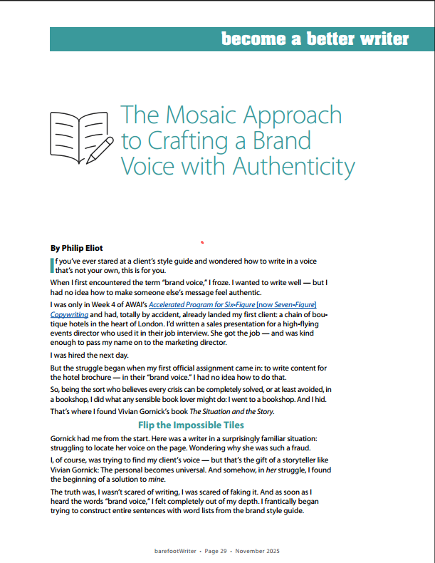 This article won an AWAI writing competition and was published ‘Barefoot Writer’ magazine in the November 2025 issue, retitled as ‘The Mosaic Approach to Crafting a Brand Voice with Authenticity’.