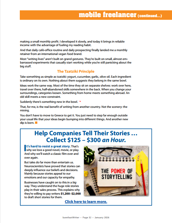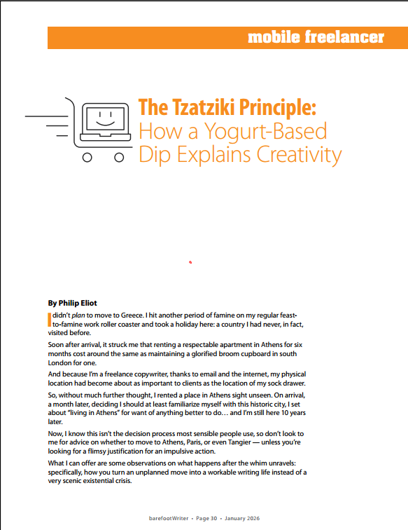 I wrote this piece for ‘Barefoot Writer’ magazine which was published in the November 2025 issue, with my title ‘The Tzakziki Principle: How a Yoghurt-Based Dip Explains Creativity’.