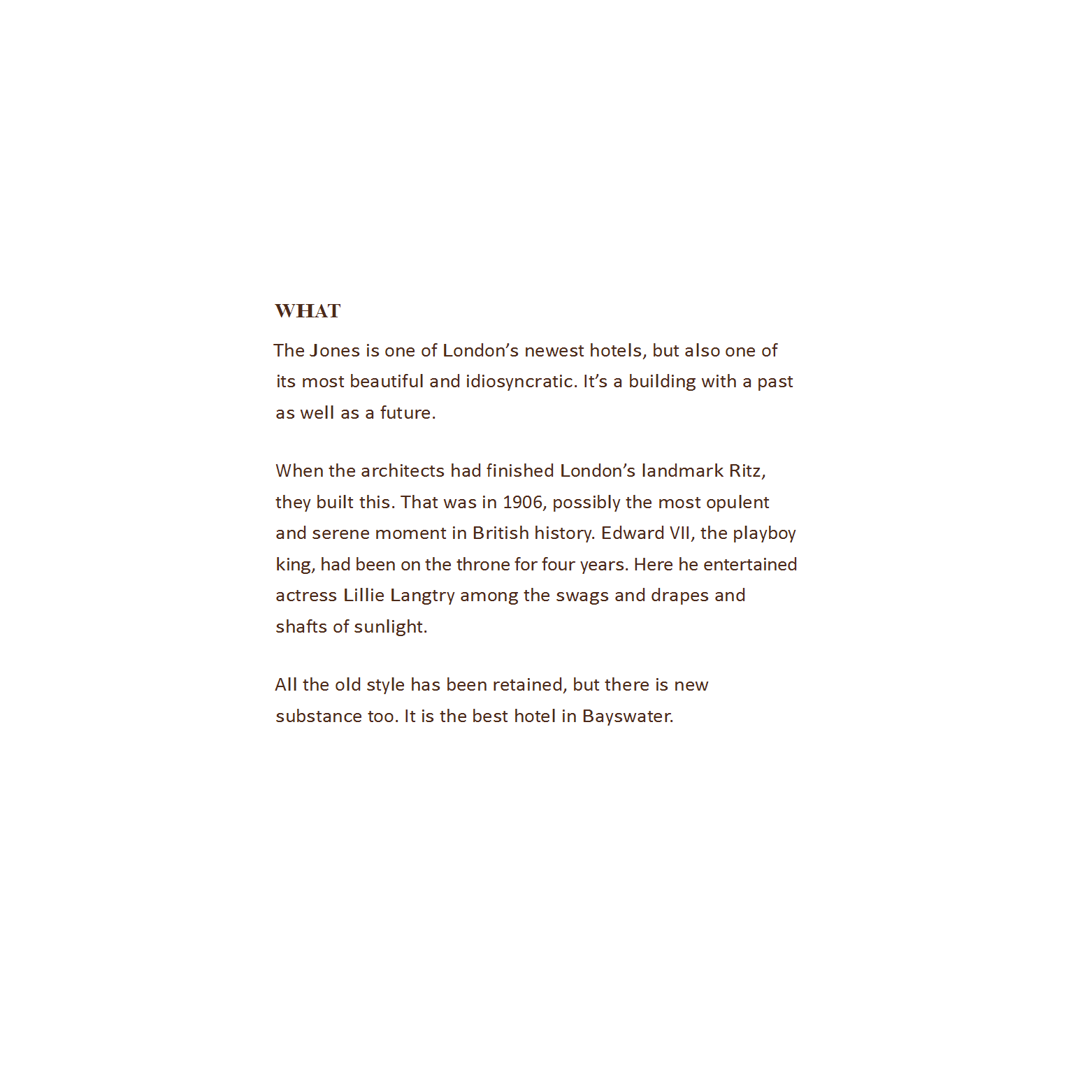 Brochure copy for The Jones Hotel, and an essential brand voice positioning statement as it was one of the first pieces of copy to be publicly available for this newly renovated hotel.
